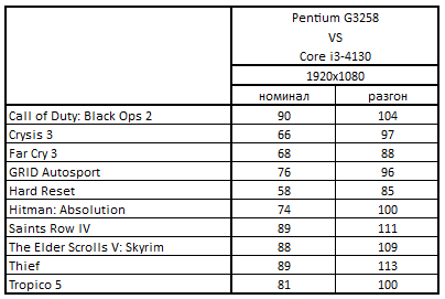 Сводная таблица производительности Pentium G3258 и Core i3-4130, где за 100% взят результат Core i3-4130