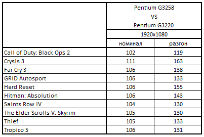 Сводная таблица производительности Pentium G3258 и Pentium G3220, где за 100% взят результат Pentium G3220