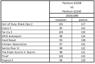 Сводная таблица производительности Pentium G3258 и Pentium G2140, где за 100% взят результат Pentium G2140