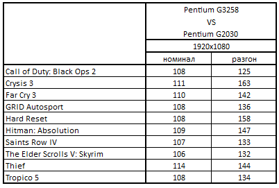 Сводная таблица производительности Pentium G3258 и Pentium G2030, где за 100% взят результат Pentium G2030