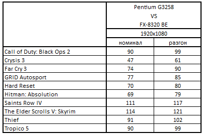 Сводная таблица производительности Pentium G3258 и FX-8320 BE, где за 100% взят результат FX-8320 BE