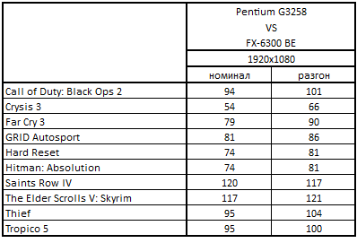 Сводная таблица производительности Pentium G3258 и FX-6300 BE, где за 100% взят результат FX-6300 BE