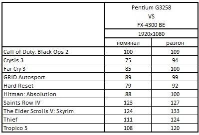 Сводная таблица производительности Pentium G3258 и FX-4300 ВЕ, где за 100% взят результат FX-4300 ВЕ