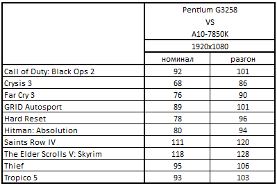 Сводная таблица производительности Pentium G3258 и A10-7850K, где за 100% взят результат A10-7850K