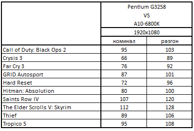 Сводная таблица производительности Pentium G3258 и A10-6800K, где за 100% взят результат A10-6800K