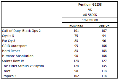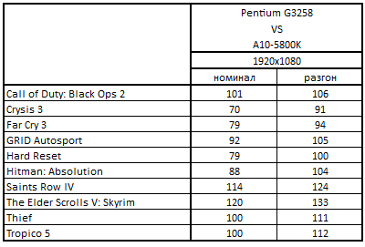 Сводная таблица производительности Pentium G3258 и A10-5800K, где за 100% взят результат A10-5800K
