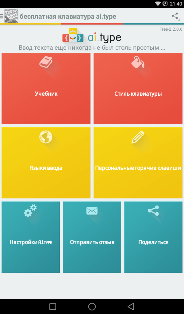 Клавиатура установлена и «активирована», но мы сразу попадаем в меню настроек. Выглядит оно ярко и дружелюбно. Красочные прямоугольники отдаленно напоминают Meto интерфейс из Windows 8 и новее, с этим ничего не поделать. Стилизованная иконка отображает пункт настроек, а снизу он еще и крупным шрифтом подписан.