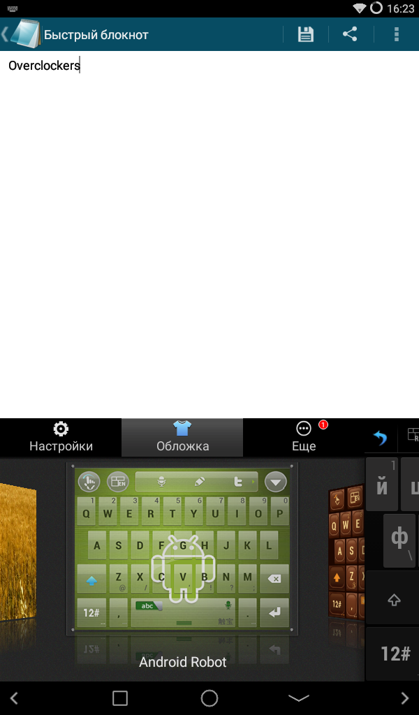 Во-первых, это переход к быстрым настройкам. Непосредственно из меню можно выбрать различные типы ввода, графические оболочки и прочие функции (посетить магазин приложений, сообщить разработчику идею/ошибку).