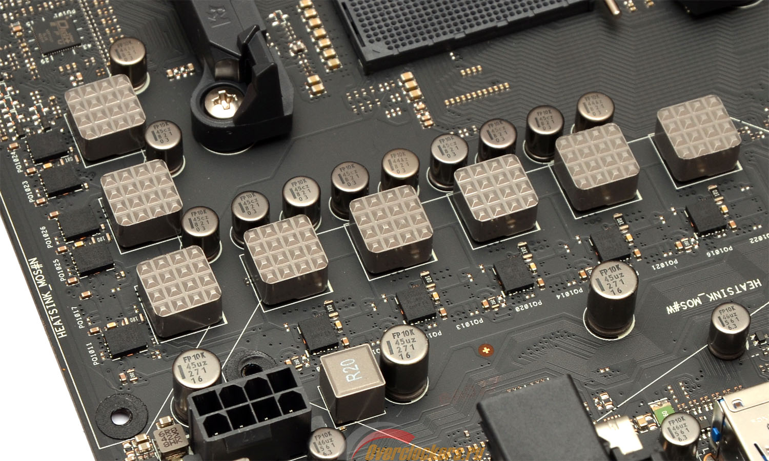 Шесть фаз (слева от процессорного разъема, на фотографии снизу) питают непосредственно CPU, еще две фазы (сверху от процессорного разъема, на снимке слева) питают встроенный в него северный мост.