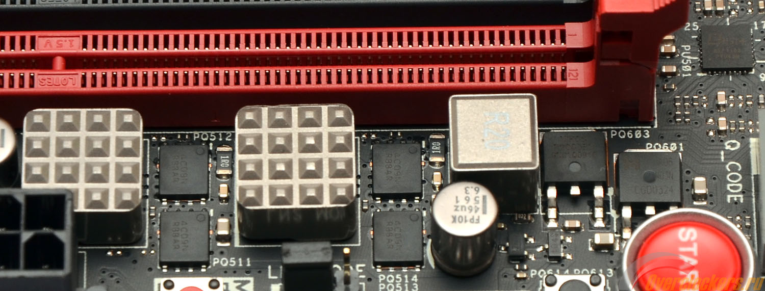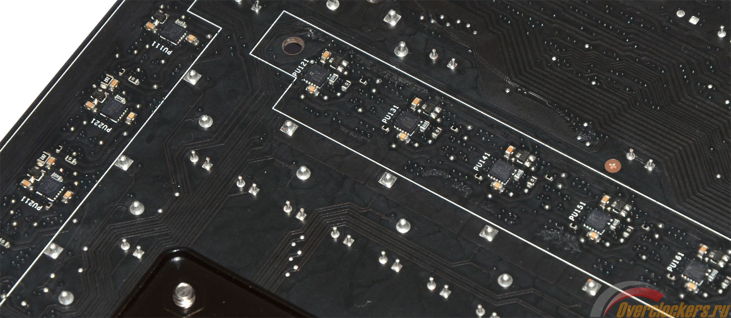 Контроллер промаркирован как DIGI+ ASP1107, скорее всего, это что-то вроде International Rectifier IR3567A. В качестве транзисторов используются десять микросхем Texas Instruments CSD87350Q5D, по одной на каждую фазу питания процессора и по две на каждую фазу питания CPU_NB. Радует, что питание CPU_NB выполнено с «удвоенными» фазами, ибо при разгоне встроенной графики это позволяет получить большой запас прочности.