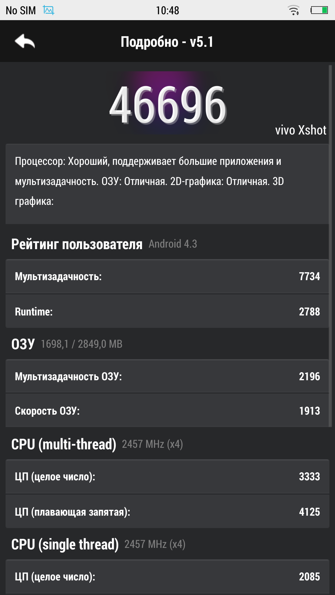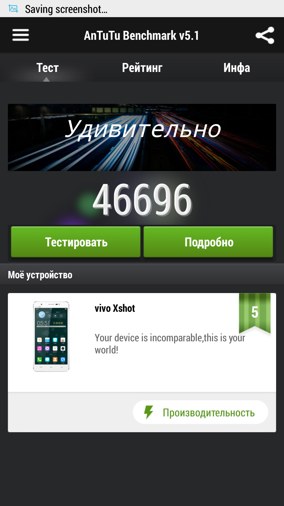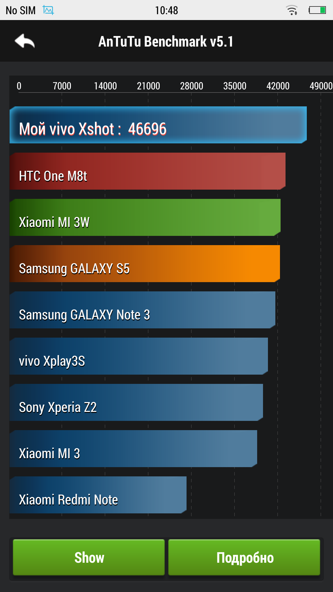 Как и ожидалось, результаты в бенчмарках высокие. Интересный факт: BBK Vivo Xshot является первым смартфоном, который сумел преодолеть 40-тысячный барьер в бенчмарке AnTuTu.