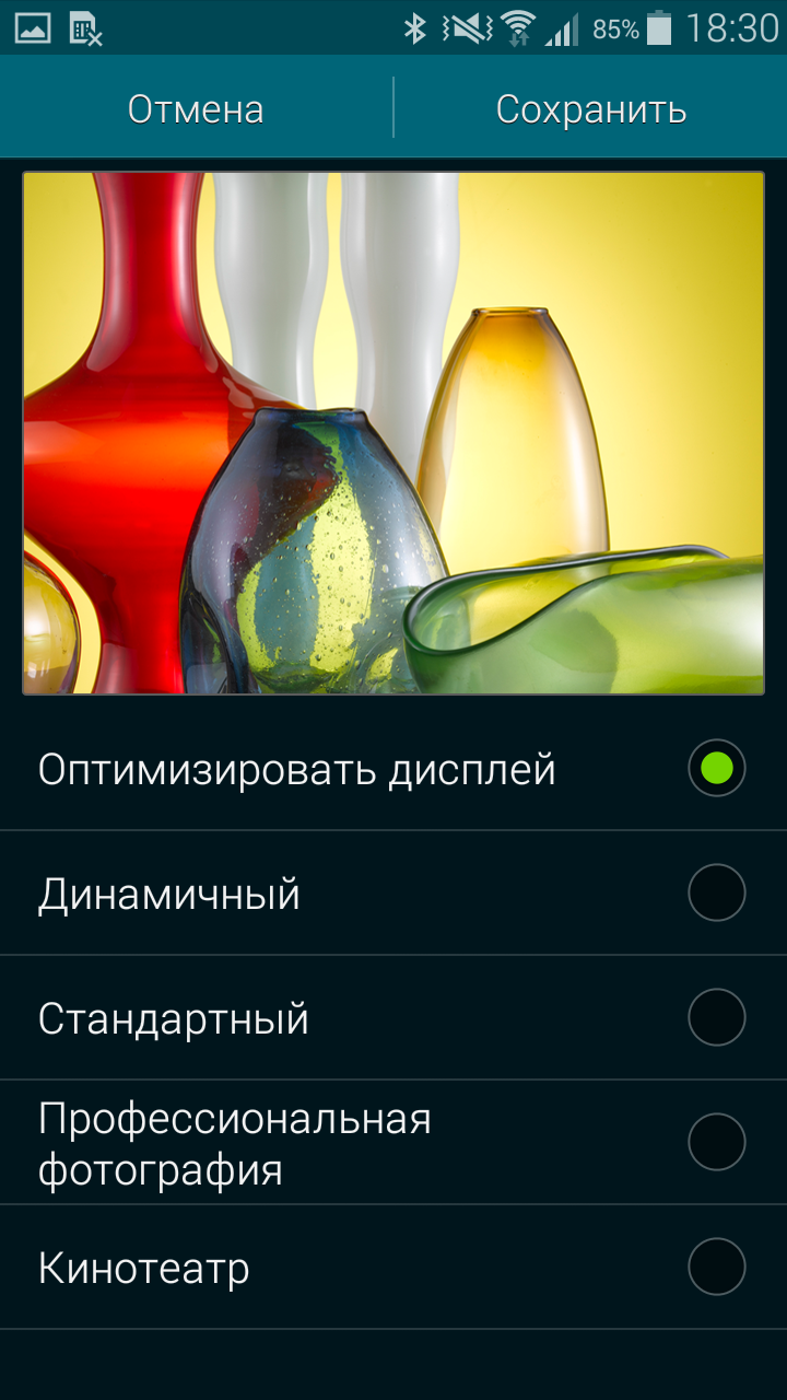 Раньше многие жаловались, что устройства с AMOLED матрицами выдают перенасыщенную, кислотную картинку, но уже давно Samsung внедрила в свои модели с подобными дисплеями различные профили цветовой настройки, которые можно выбрать в меню, либо просто выбрать пункт «Оптимизировать дисплей», и тогда аппарат сам будет выбирать нужные настройки в зависимости от запущенного приложения.