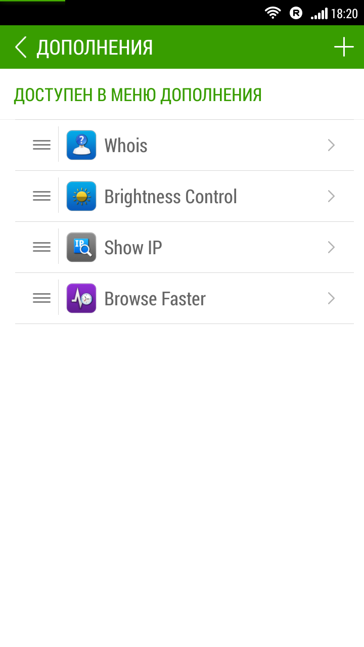 - Дополнения. Расширьте возможности вашего мобильного интернет-браузера, установив дополнения, которые позволят быстрее справиться с вашими задачами простым касанием пальцев. Более 60-ти Dolphin-дополнений позволят вам произвести любые действия в самом браузере. Вы можете узнать, как они работают, проверив три предварительно загруженных дополнения на правой боковой панели.