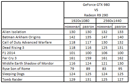 Сводная таблица производительности GeForce GTX 980 4096 Mбайт и Radeon R9 290X 4096 Мбайт, где за 100% взят результат Radeon R9 290X 4096 Мбайт
