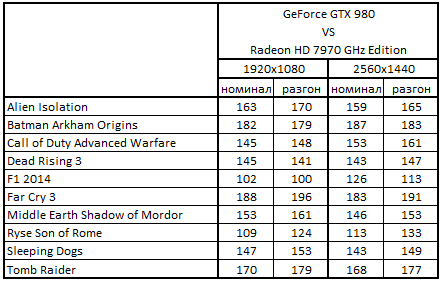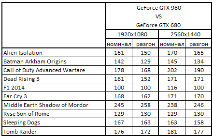 Сводная таблица производительности GeForce GTX 980 4096 Mбайт и GeForce GTX 680 2048 Mбайт, где за 100% взят результат GeForce GTX 680 2048 Mбайт