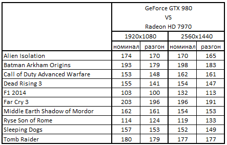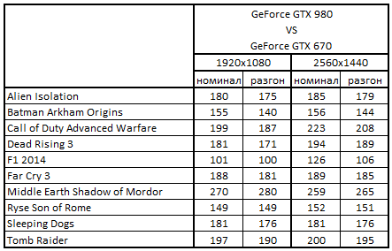 Сводная таблица производительности GeForce GTX 980 4096 Mбайт и GeForce GTX 670 2048 Mбайт, где за 100% взят результат GeForce GTX 670 2048 Mбайт
