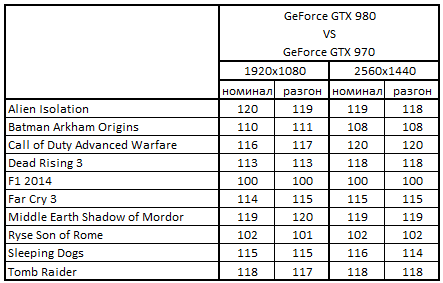 Сводная таблица производительности GeForce GTX 980 4096 Mбайт и GeForce GTX 970 4096 Mбайт, где за 100% взят результат GeForce GTX 970 4096 Mбайт
