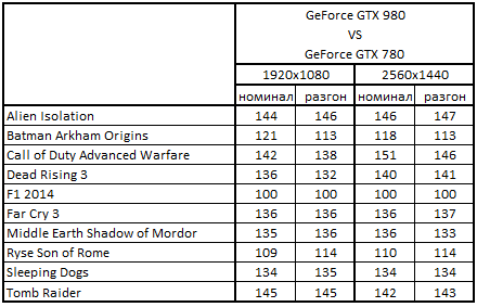 Сводная таблица производительности GeForce GTX 980 4096 Mбайт и GeForce GTX 780 3072 Мбайт, где за 100% взят результат GeForce GTX 780 3072 Мбайт