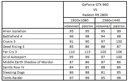 Сводная таблица производительности GeForce GTX 960 2048 Мбайт и Radeon R9 280 3072 Мбайт, где за 100% взят результат Radeon R9 280 3072 Мбайт