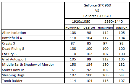 Сводная таблица производительности GeForce GTX 960 2048 Мбайт и GeForce GTX 670 2048 Mбайт, где за 100% взят результат GeForce GTX 670 2048 Mбайт