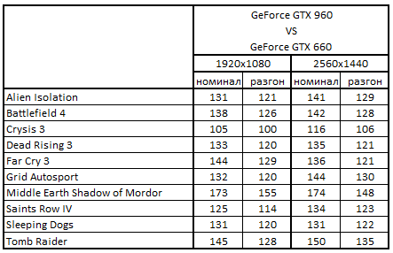 Сводная таблица производительности GeForce GTX 960 2048 Мбайт и GeForce GTX 660 2048 Mбайт, где за 100% взят результат GeForce GTX 660 2048 Mбайт
