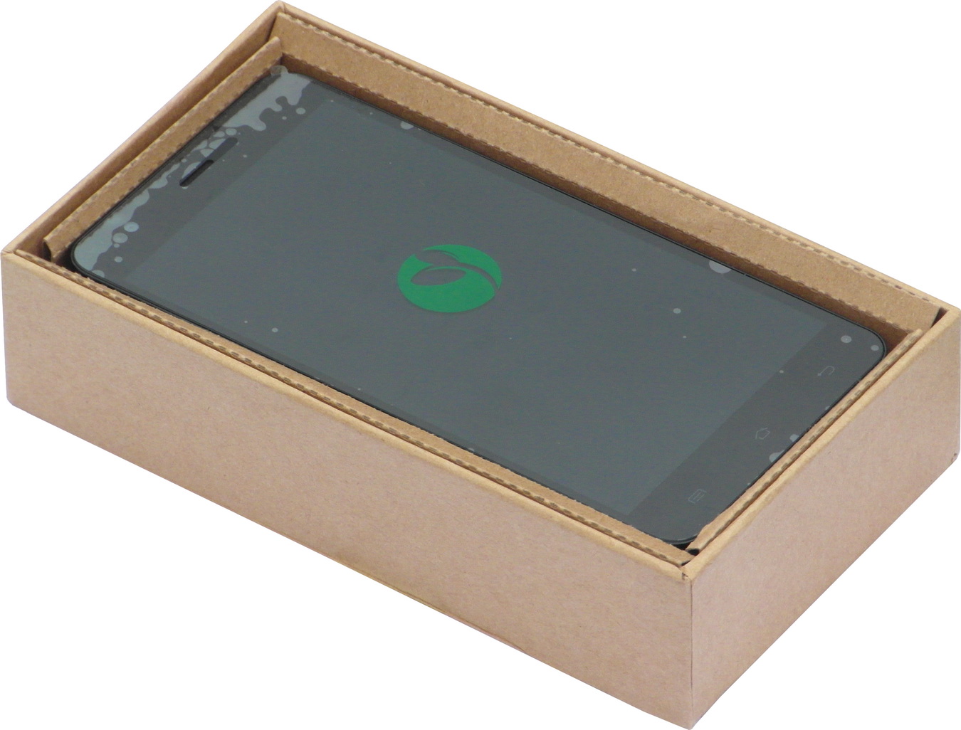 Там скрывается сам смартфон, на который наклеена транспортная защитная пленка с логотипом компании, изображающим молодой росток растения, тянущийся вверх к солнцу.