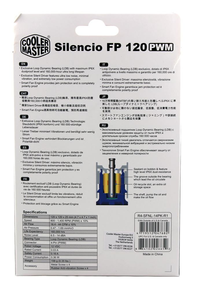 Модель поставляется в небольшой коробке чуть больше, чем она сама. На упаковке присутствует иллюстрация продукта, а также указания о скорости вращения и уровне звукового давления. С противоположной стороны находится схематичное изображение подшипника Loop Dynamic Bearing, который должен отработать около 160 000 часов. Сюда же вынесена подробная таблица характеристик.