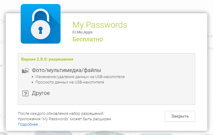 Да и с разрешениями тоже все нормально. Только «Изменение/удаление данных на USB-накопителе» и «Просмотр данных на USB-накопителе». Ничего лишнего, хотя и присутствует хитрый пункт «Другое», позволяющий разработчику вносить корректировки в разрешения.
