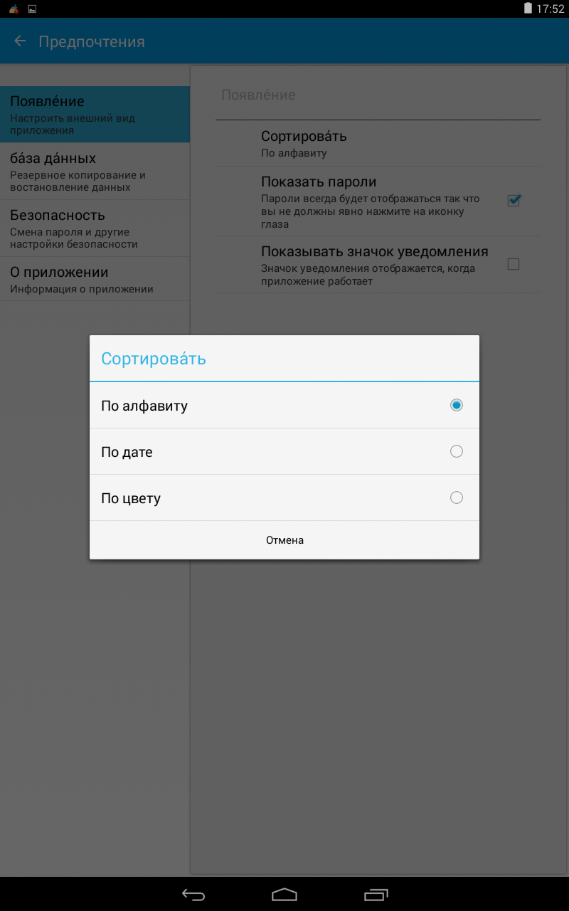 Настройки не блещут особым разнообразием. Присутствует сортировка (по алфавиту, по дате, по цвету), возможность отображать пароли (по нажатию на «глаз»), а также показывать значок уведомления, когда приложение работает.