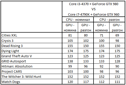 Сводная таблица производительности "Core i3-4370 + GeForce GTX 980" и "Core i7-4790K + GeForce GTX 960", где за 100% взят результат "Core i7-4790K + GeForce GTX 960"