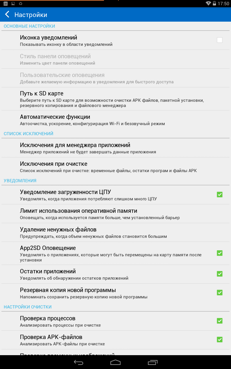 Ниже можно активировать анализ фоновых процессов, APK-файлов, временных изображений при очистке, а также сохранять большие картинки на неделю перед окончательным удалением. А, вдруг передумаете? Как бы там не было такую заботу можно деактивировать, что радует.