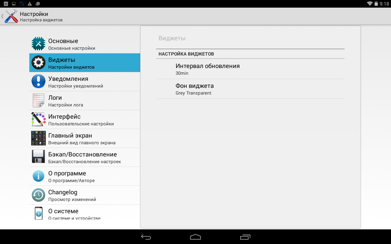 Следующий пункт параметризации – виджеты. Здесь выбираем интервал, фон виджета и время его обновления.