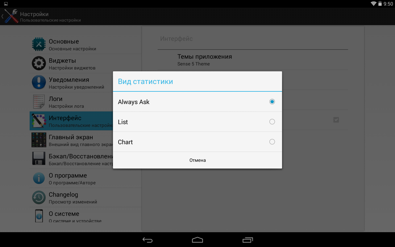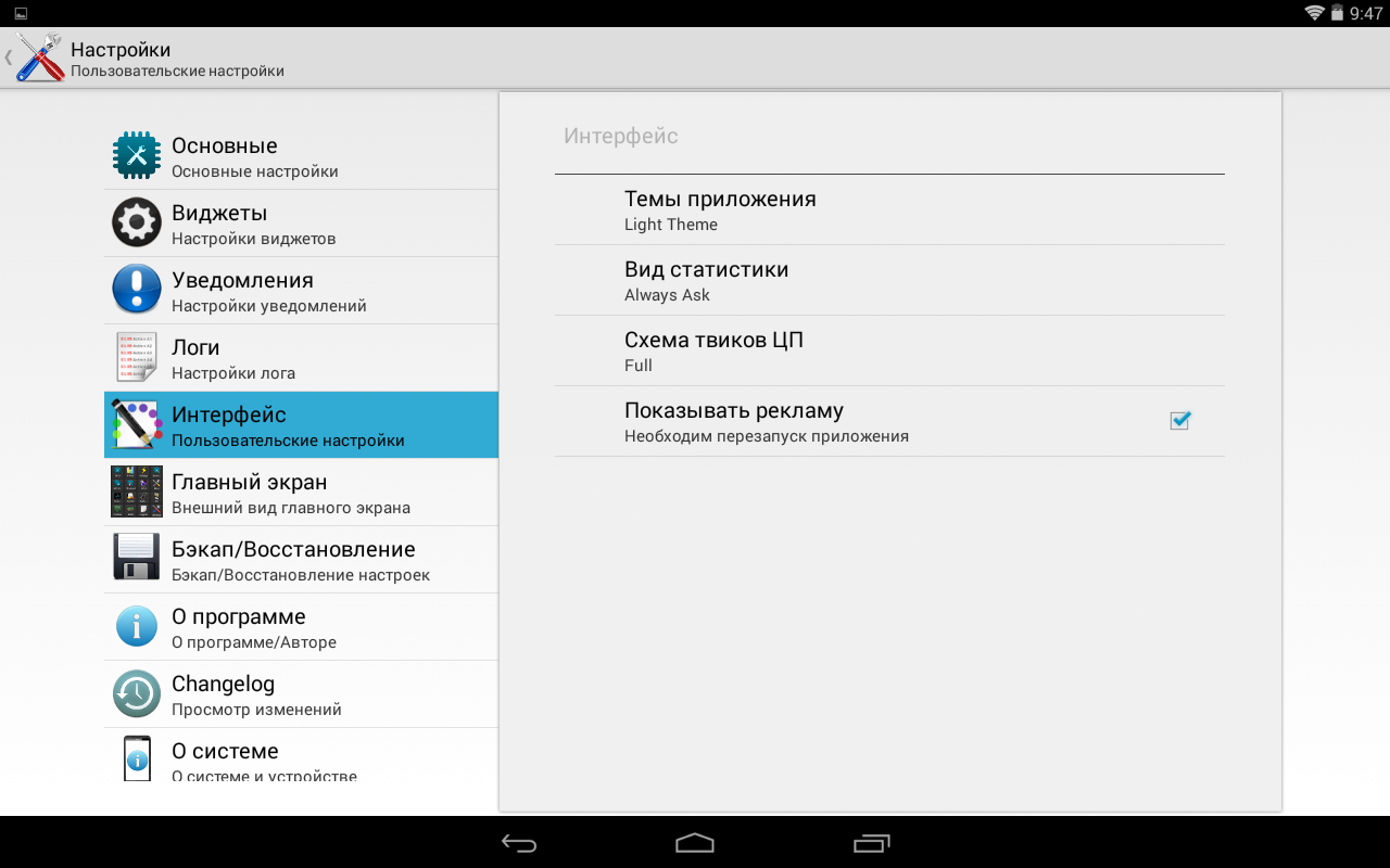 Позаботились и об интерфейсе. Доступно семь тем оформления, вид статистики (лист или чарт), а также (внимание!) отключение рекламы (потребуется перезапустить приложение). При этом отключение баннера не требует денег. Подход, конечно, странный, но понравится многим, если не всем.