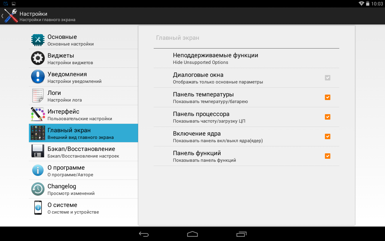 Главный экран настраивается. Можно как скрыть неподдерживаемые устройством функции, так и попросту их отключить, чтобы не заморачивать лишний раз CPU, да и просто не травить душу, как это происходит в нашем случае.