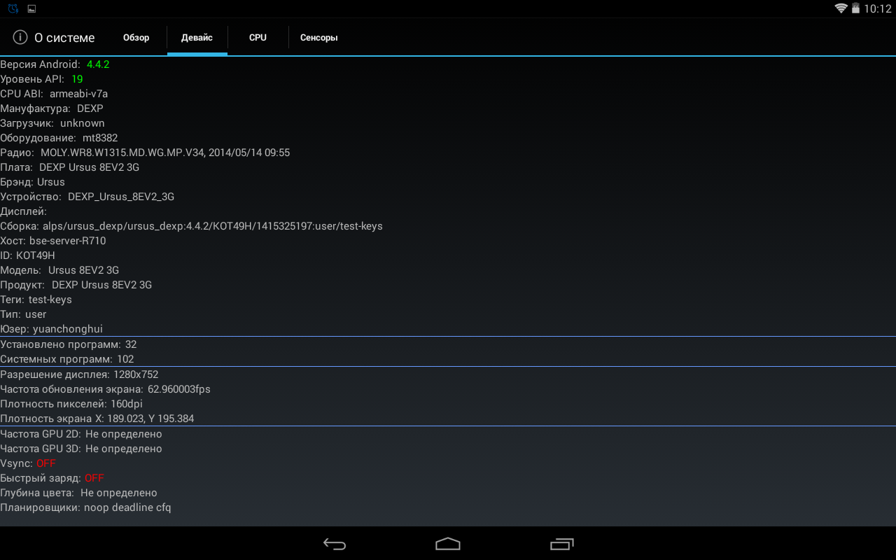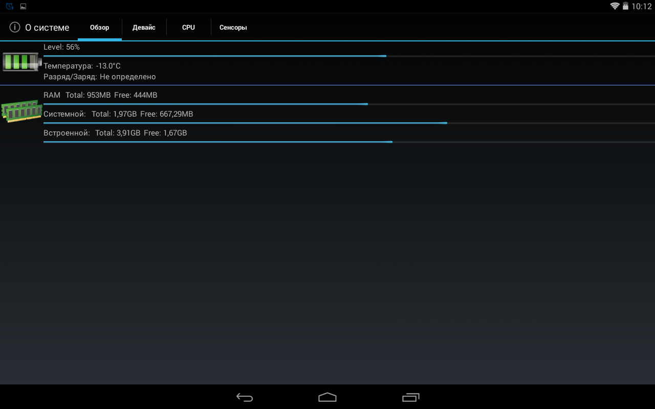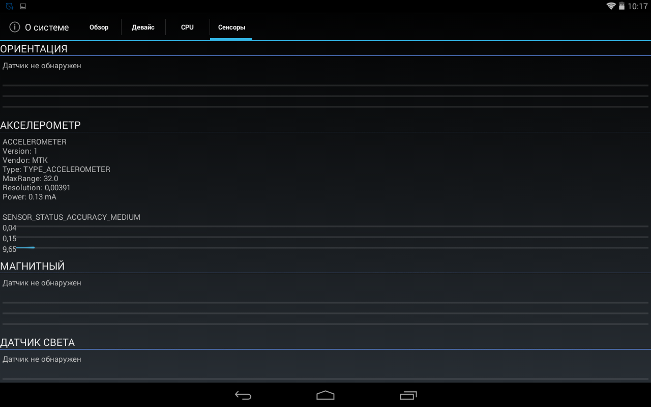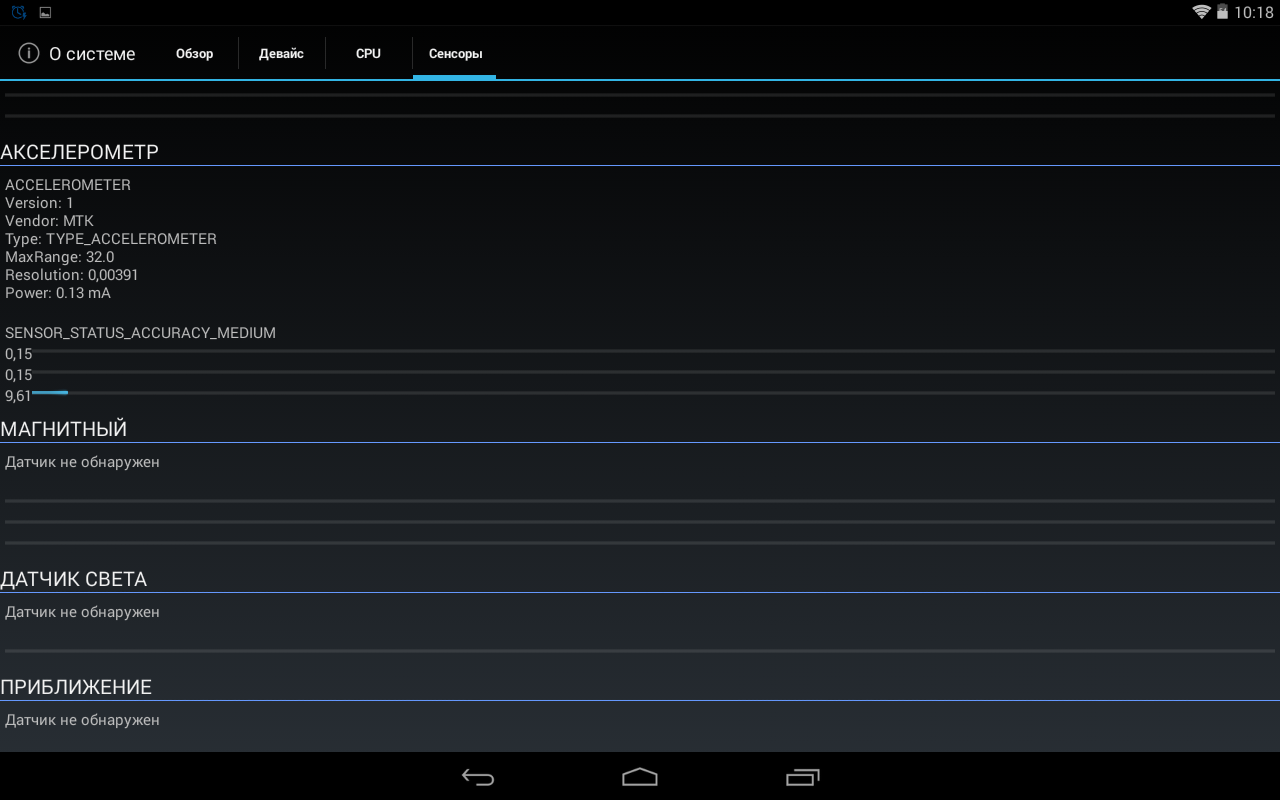 Очень интересно реализовано меню сенсоров. В нем отображаются все возможные датчики и можно реально проверить их наличие. Например, для акселерометра доступна шкала ориентации по трем точкам в реальном времени. Можно посмотреть напряжение и диапазон акселерометра, а также узнать производителя сенсора и его модель. Просто отлично!