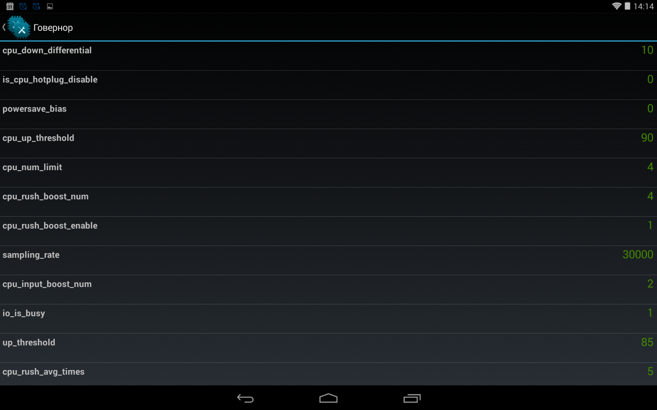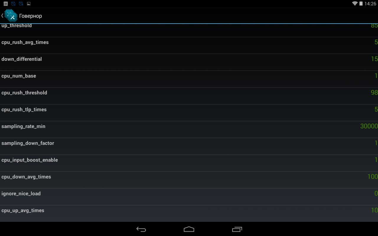 Например, здесь можно прописать любой верхний/нижний порог для CPU, включить все ядра процессора или же, наоборот, ограничиться одним, установить период времени (в микросекундах), в котором governor будет производить изменения и так далее. Так, для «up threshold» можно выставить значение от 1% до 100% загрузки CPU. И когда наступает указанная загрузка процессора, governor повышает значение частоты CPU. А «down threshold» делает все с точностью до наоборот.