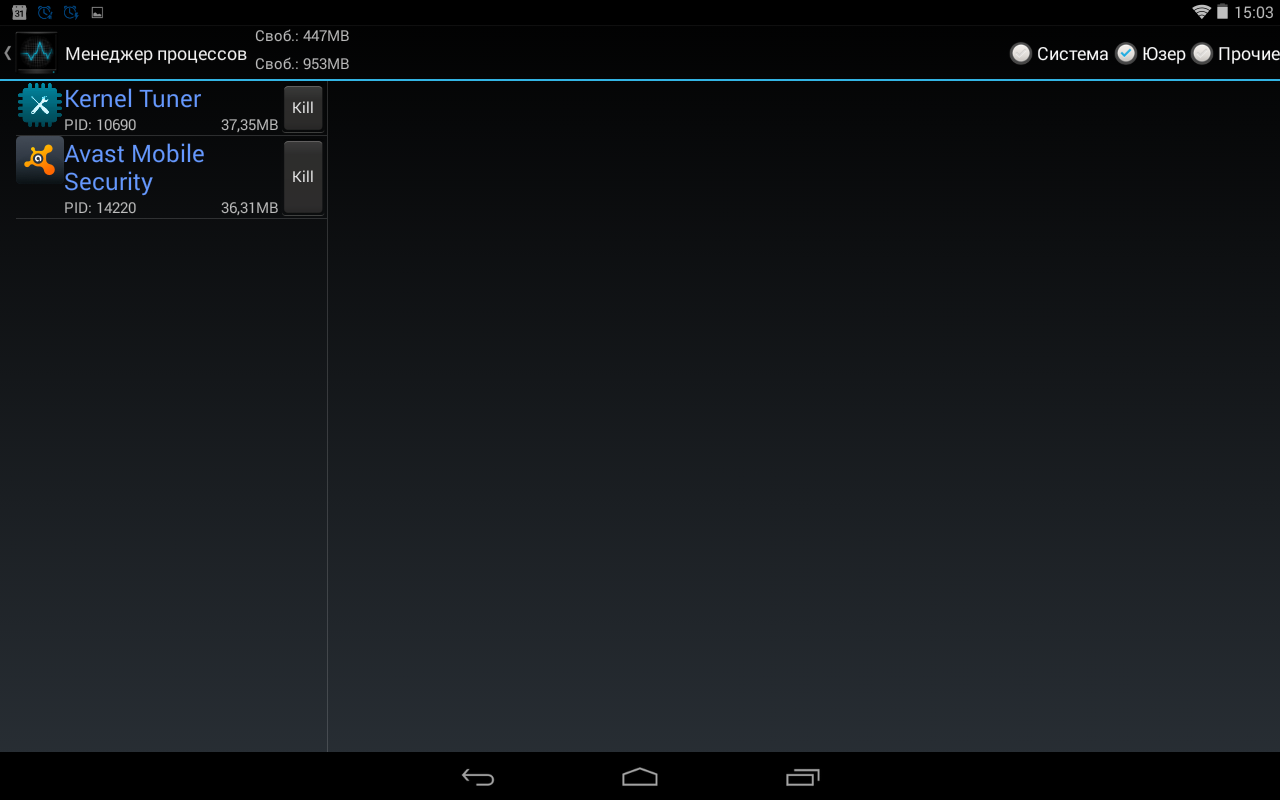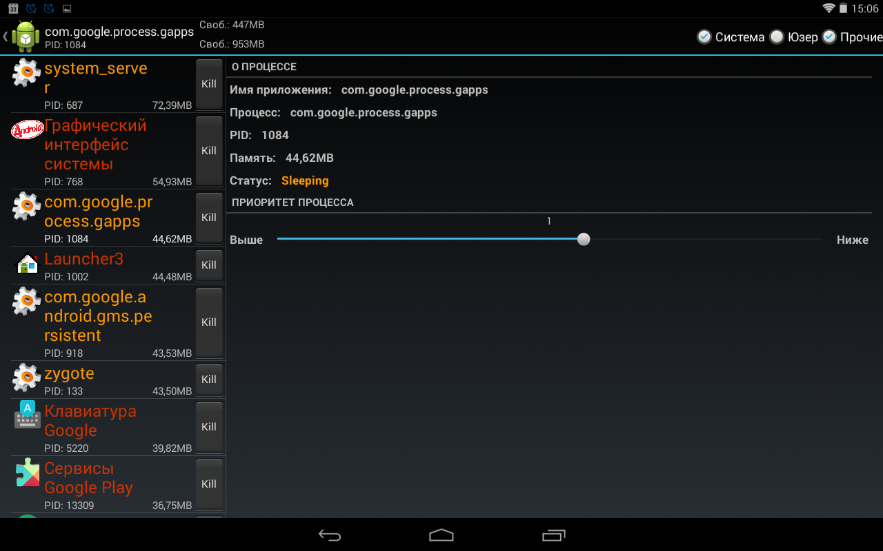 Конечно, с системными процессами надо быть поосторожнее, однако если и напортачите, то просто перезагрузите устройство. Можно выставить для каждой задачи свой приоритет, а также посмотреть о ней исчерпывающую информацию: PID, количество занятой памяти и статус. В правом верхнем углу можно отсортировать процессы на системные, пользовательские и «прочие».