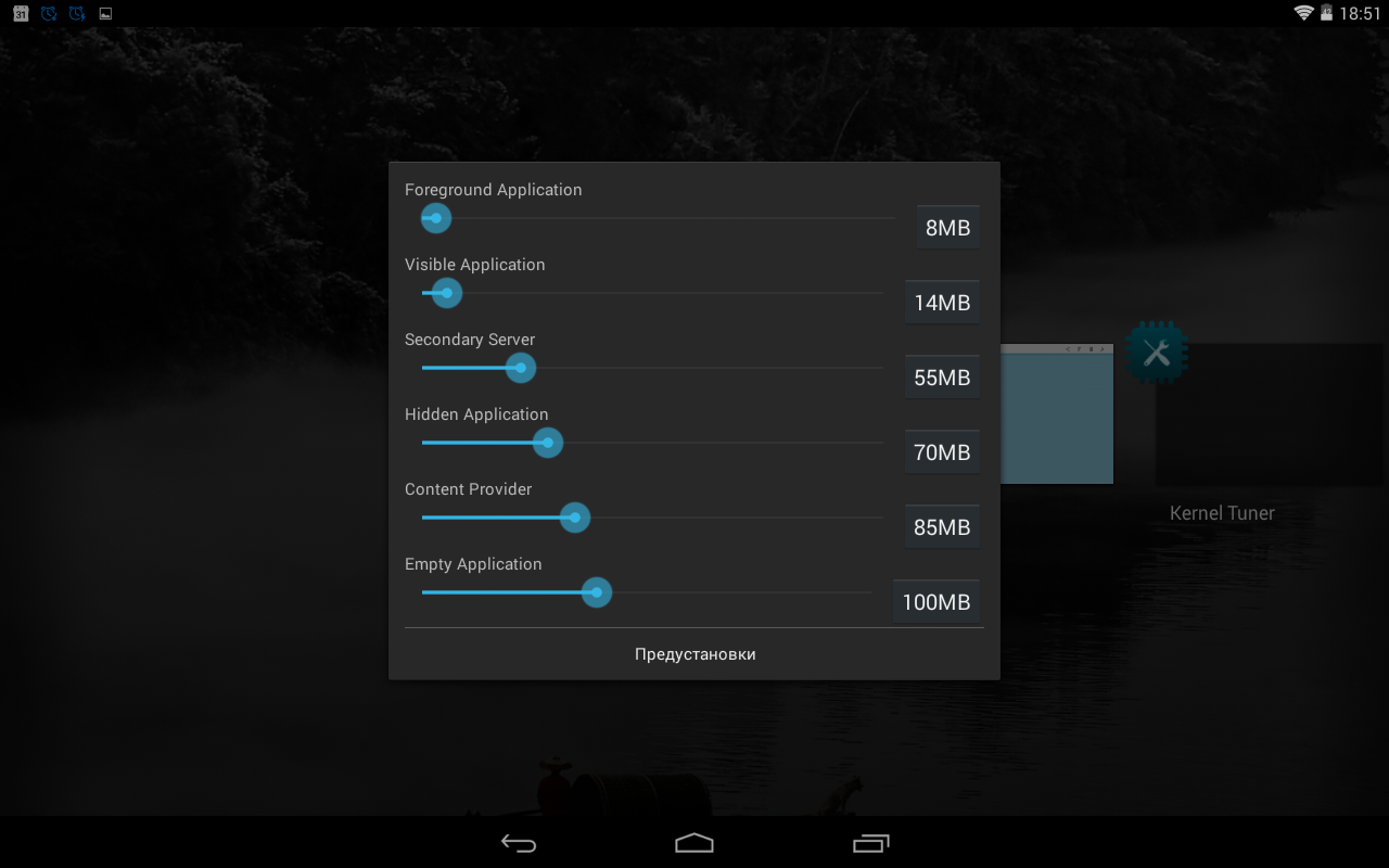 Например, очень легкий, легкий, средний агрессивный и мега-агрессивный стиль работы OOM-менеджера. Помимо этого, можно включить 256-, 512- и 1024-мегабайтный режим.