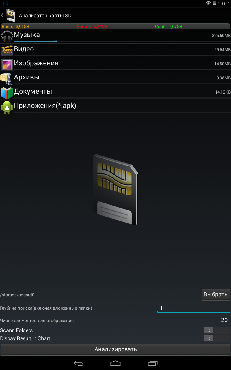 Тут все просто. Смотрим, что и сколько занимает места на SD-карте, например, сколько занимает музыка или архивы. Также реализован небольшой примитивный файловый менеджер. Если этого мало, можно воспользоваться анализатором, предварительно установив необходимую глубину поиска, возможность поиска в подкаталогах и выбрав необходимое количество элементов для отображения.