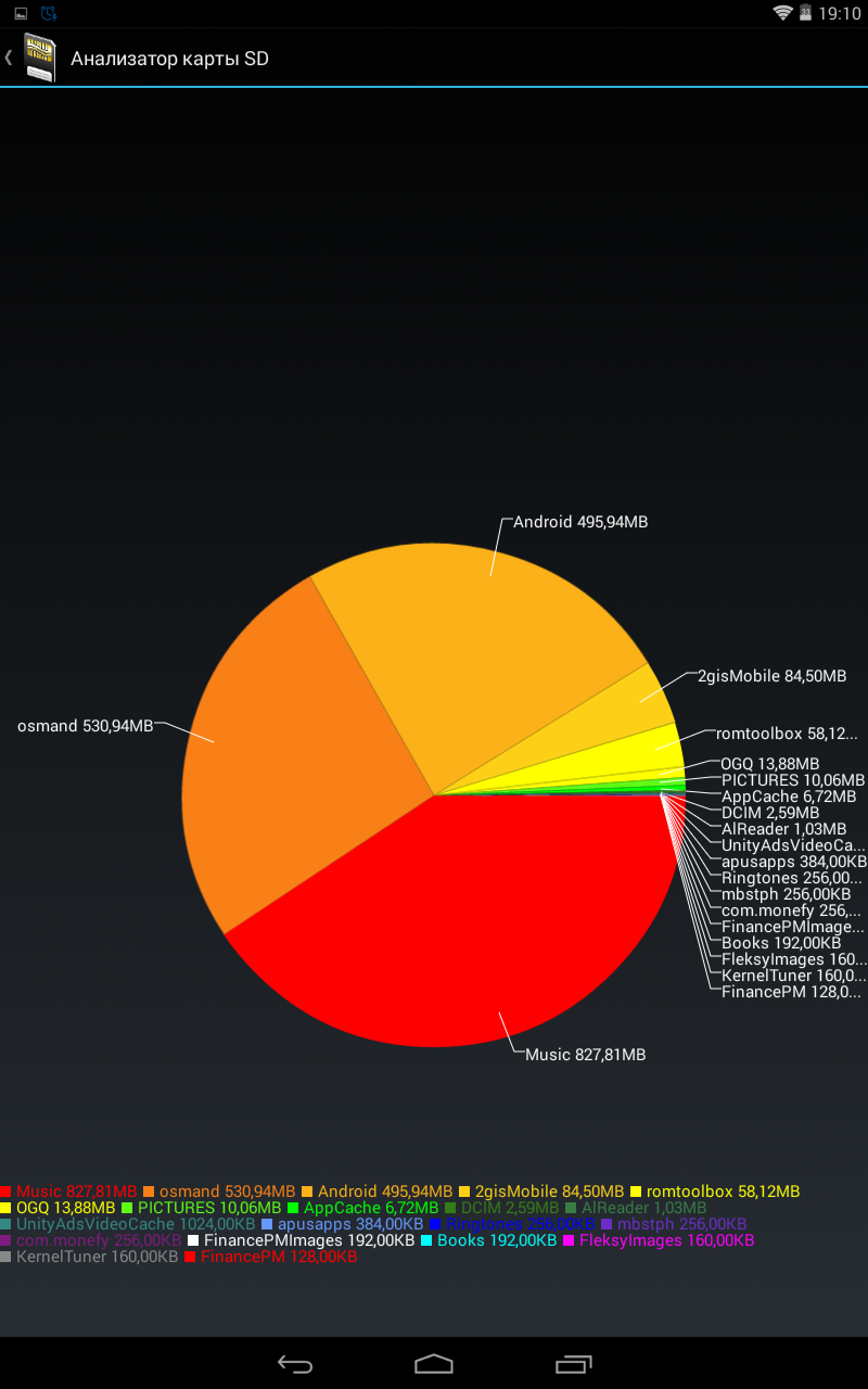В итоге вы получите круговую диаграмму, где сносками будет показано, что именно и сколько занимает места на SD-карте.