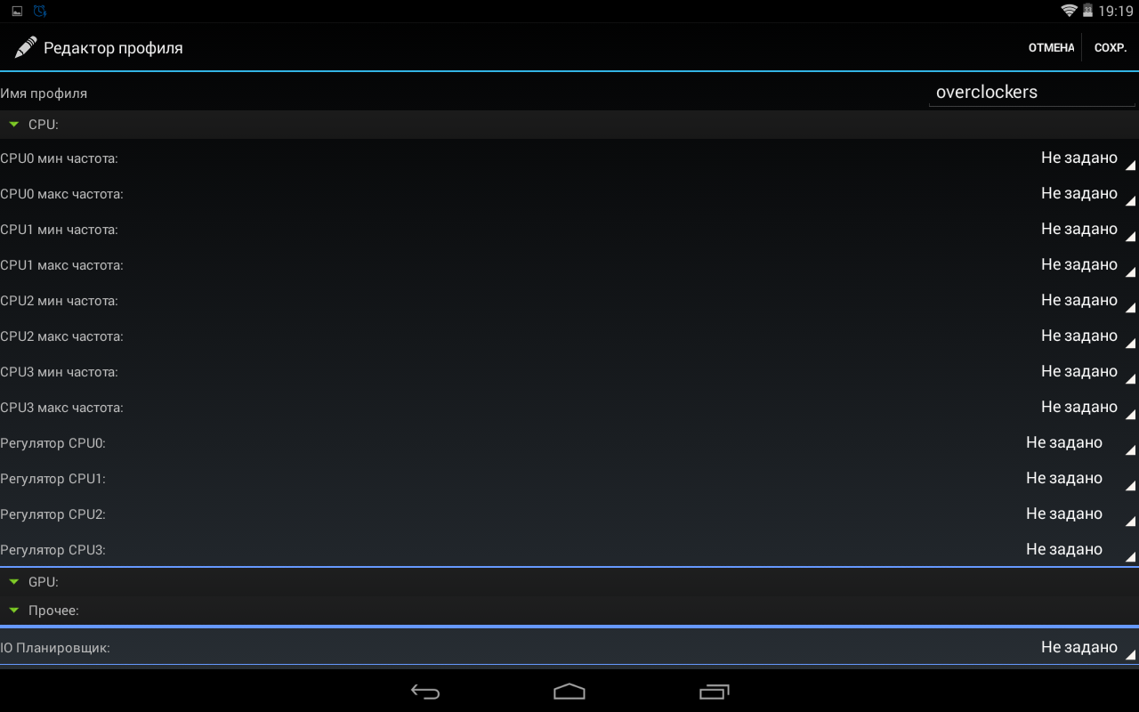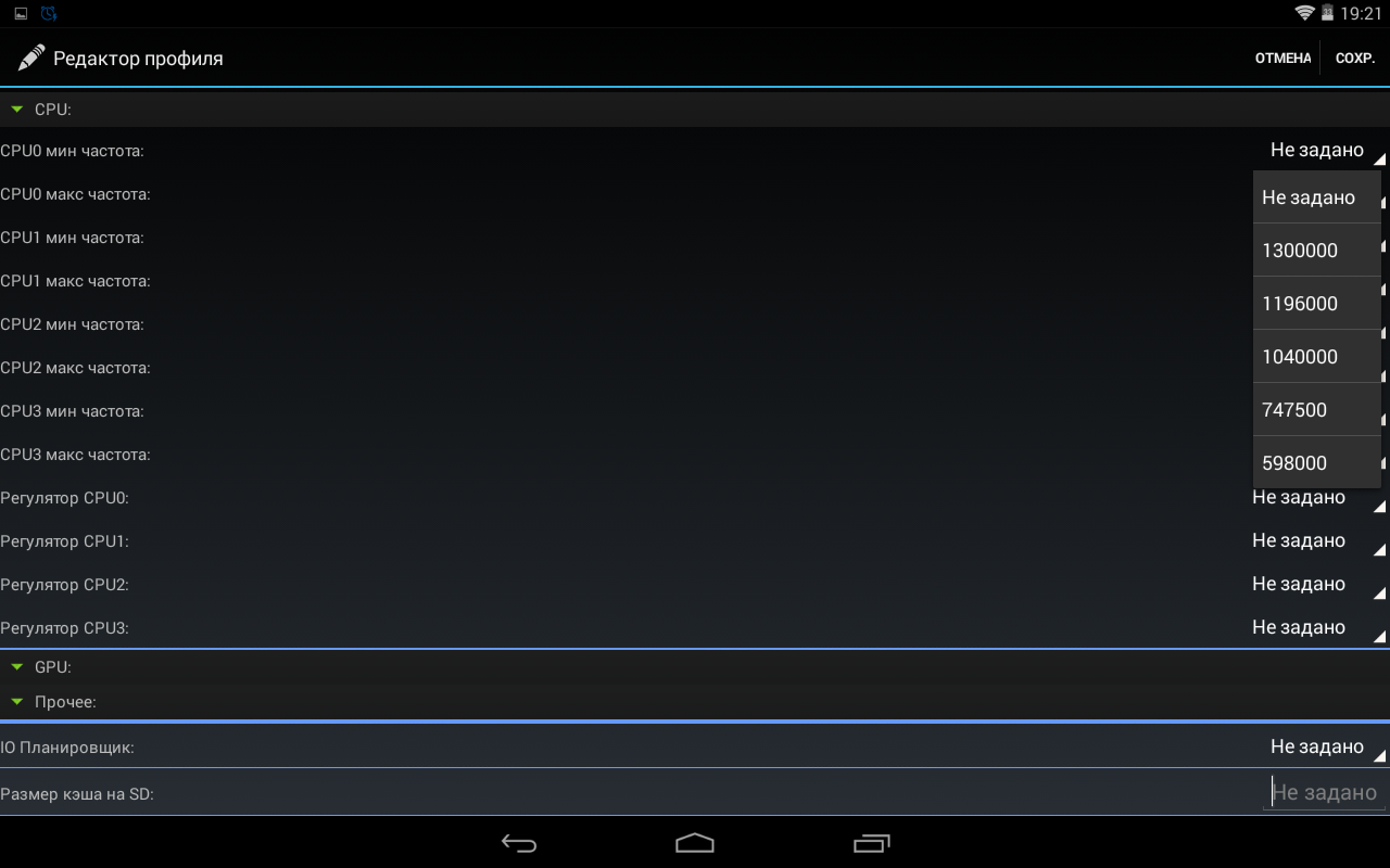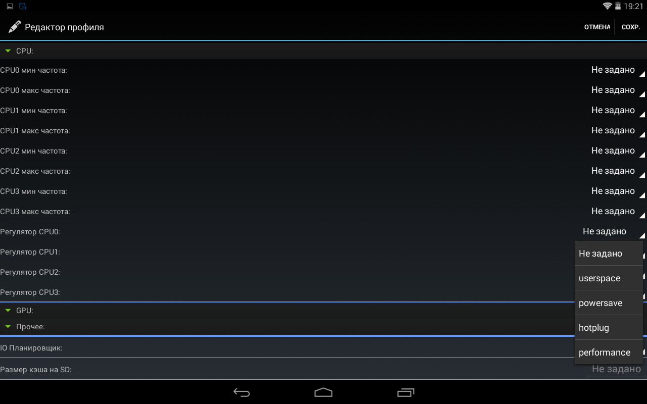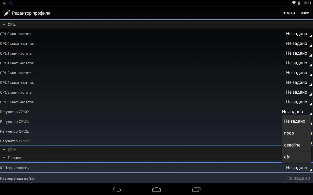 Прежде всего задаем минимальную и максимальную частоту для каждого ядра, далее определяемся с говернорами. Поскольку управление GPU нам недоступно, то пропускаем этот пункт и переходим к параметризации IO-планировщика, и заканчиваем все это дело установкой необходимого размера кэша на SD-карту.