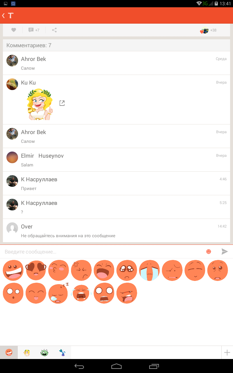 Для демонстрации приватного общения напишем на аккаунт разработчиков. Само общение происходит последовательно ровным потоком. Помимо забавных смайликов можно отправить любое изображение из системной галереи, сделать снимок или записать видеоролик, а также поделиться местонахождением и… отправить музыкальный трек.