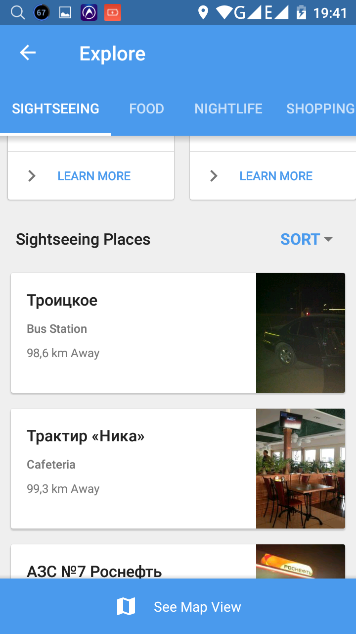 Не обошлось и без традиционного для таких приложений гида. Причем он меня приятно удивил, поскольку описание ближайших мест, остановок и достопримечательностей можно назвать актуальным.