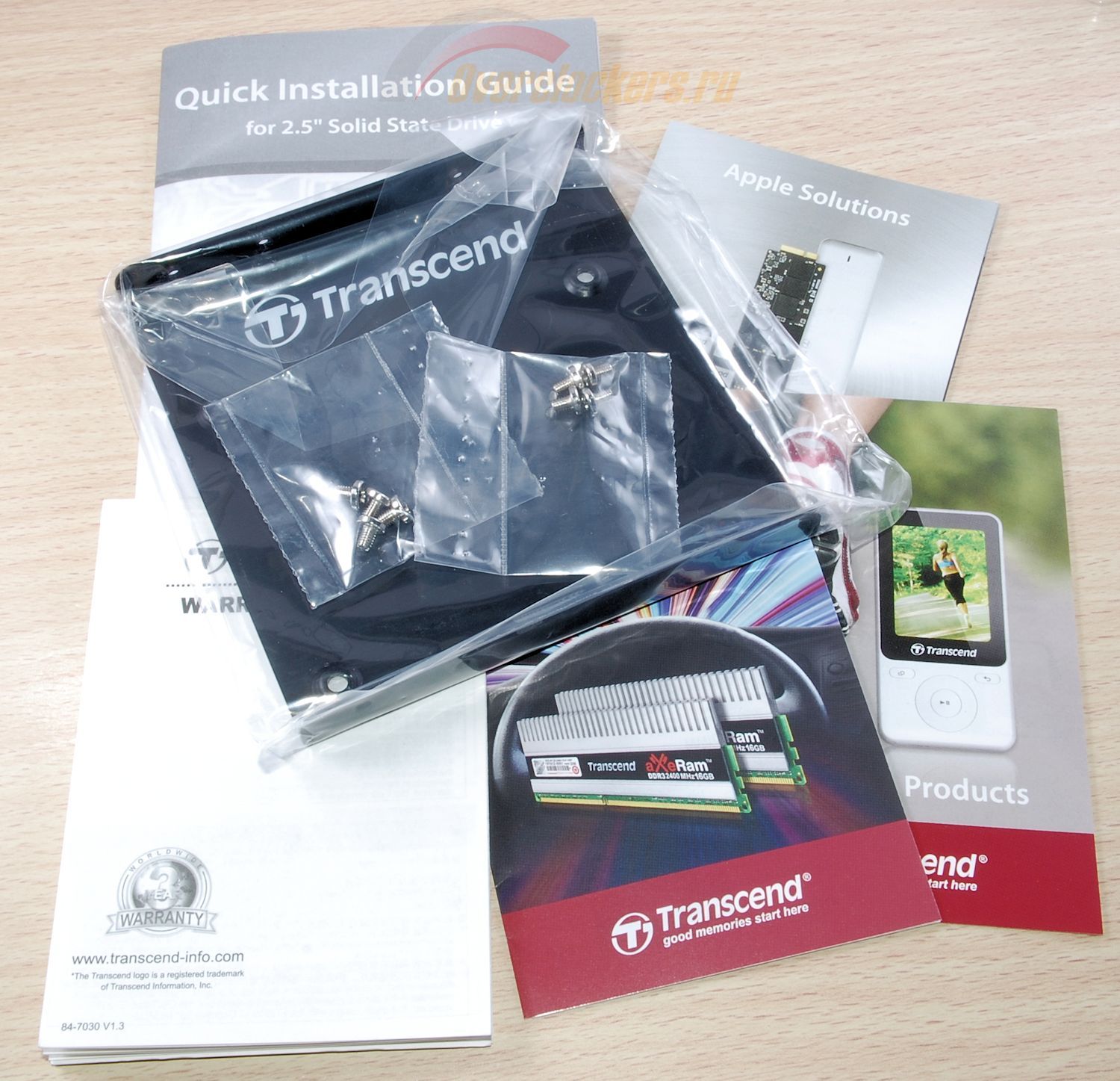 Но зато видно, что Transcend ничуть не беспокоится об экологии: количество рекламных буклетов в комплекте и их размеры только увеличились. Благо хотя бы на месте остались два комплекта крепежных винтов и адаптер для установки накопителя в посадочное место корпуса системного блока, рассчитанное на модели форм-фактора 3.5".