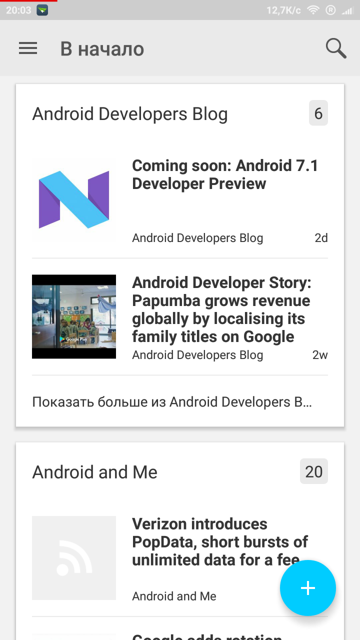 Главное меню выполнено в виде плиток Material Design с актуальными новостями. Если ресурсов, на которые мы подписаны у нас мало, то новости группируются по источникам. Вариантов отображения новостей у нас три – список, расширенный список и карточками. Правда все они однотипные и однообразные, может в этом заключается специализация приложения под продвинутых пользователей? Не думаю.