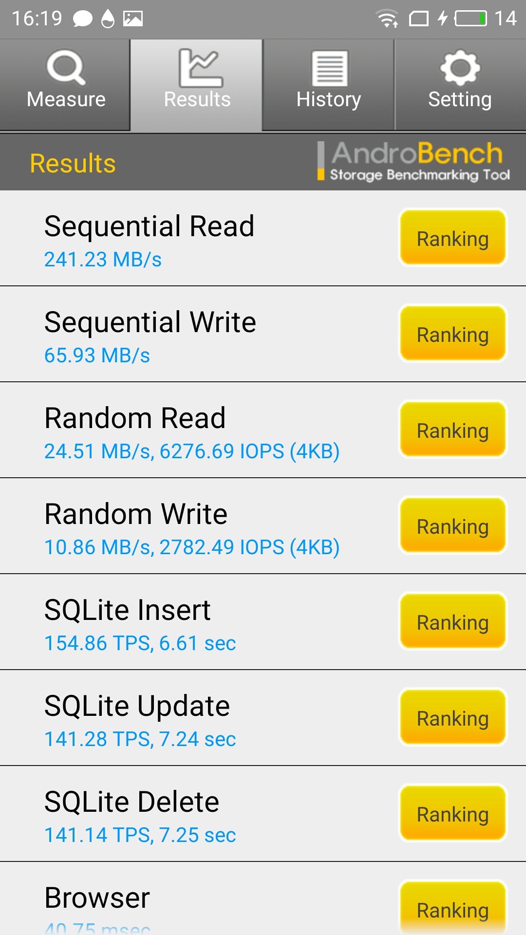 С помощью приложения AndroBench было проведено тестирование скорости файловой системы.