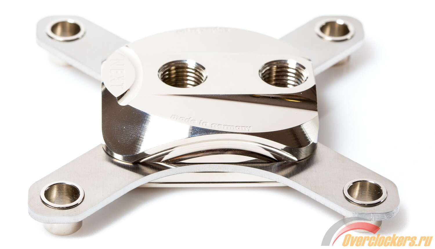 Данная модель водоблока получила металлическую крышку и полностью никелированное покрытие. Сверху по центру крышки расположена небольшая полоска в виде выступа. На ней можно наблюдать два отверстия под фитинги с резьбой G1/4. Кроме того, в крышке выфрезерованы надписи Cuplex Kryos, Next и грозная made in Germany.
