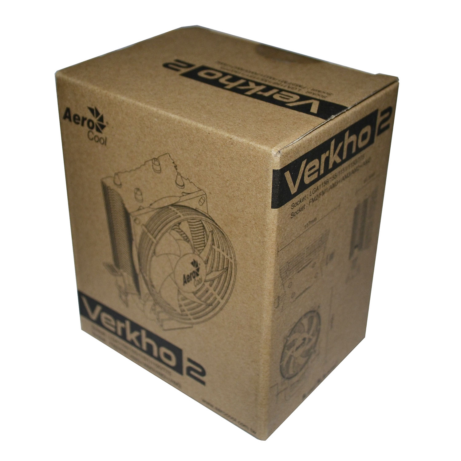 Система охлаждения Verkho2 поставляется в небольшой (115 х 90 х 135 мм) коробочке, выполненной из гофрированного картона натурального цвета. Дизайн упаковки уже знаком нам по модели AeroCool BAS, оформление простое, но информативное.