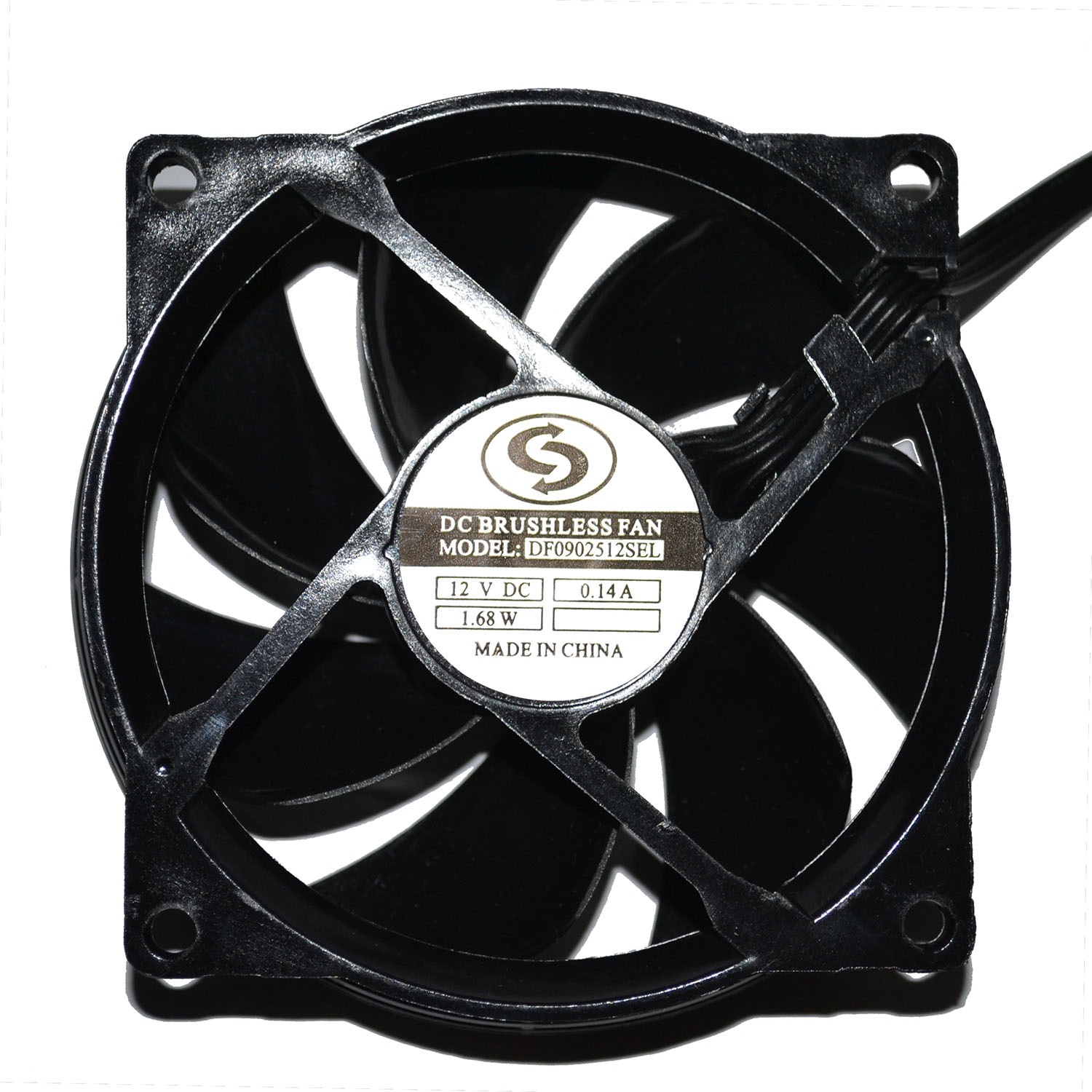 Из маркировки выясняется модель – DF0902512SEL, напряжение – 12 В, потребляемый ток – 0.14 А, мощность – 1.68 Вт.