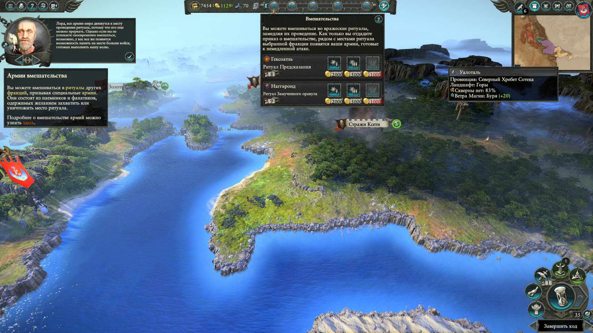 В игре появилась фича, присущая вселенной Warhammer: у расы высших эльфов стали доступны обряды. На ограниченное количество ходов они позволяют получить определенный набор навыков и умений, а также экономические и социальные эффекты. Так перед важной битвой я совершил ритуал "Призыв Ваула", который добавил всем войскам способность "Молот Ваула".
